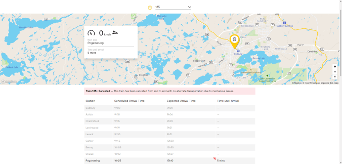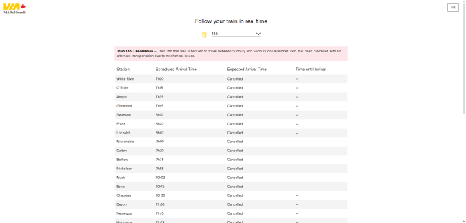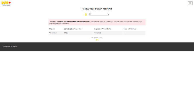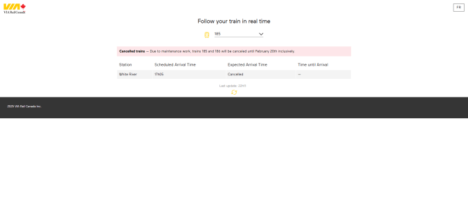 «We’re reaching out with regard to your upcoming reservation on train 186. Train 186 that was scheduled to travel between White River and Sudbury on [date] has been cancelled with no alternate transportation due to mechanical issues. […] Please accept our sincere apologies for any inconvenience this may cause. Thank you for your understanding.» — Travel advisory for trips scheduled on April 18th and December 28th 2025
