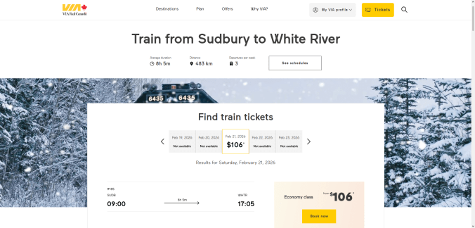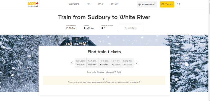 The company’s only operating train set in this isolated area of Northern Ontario is undergoing substantial maintenance work until at least the third weekend of February. VIA Rail will not be providing alternate transportation for the duration of this service interruption.